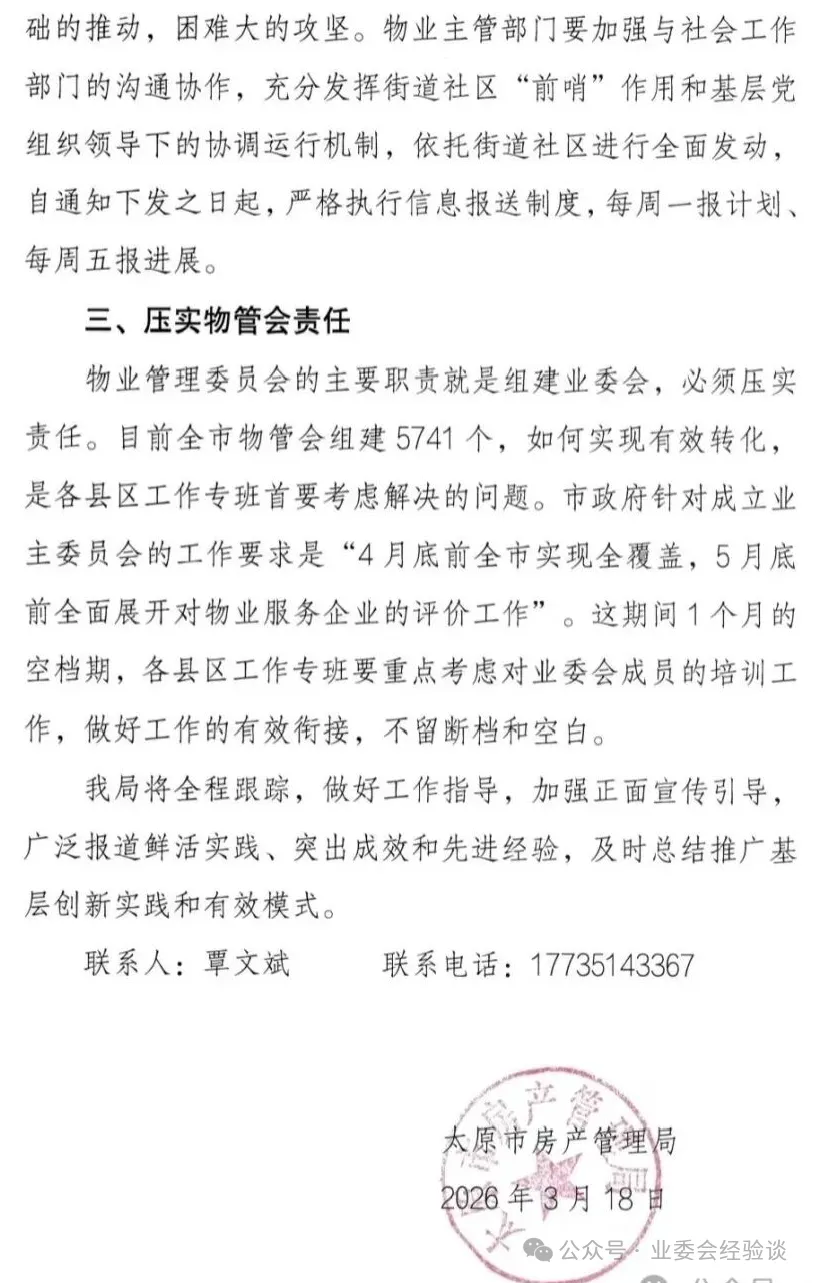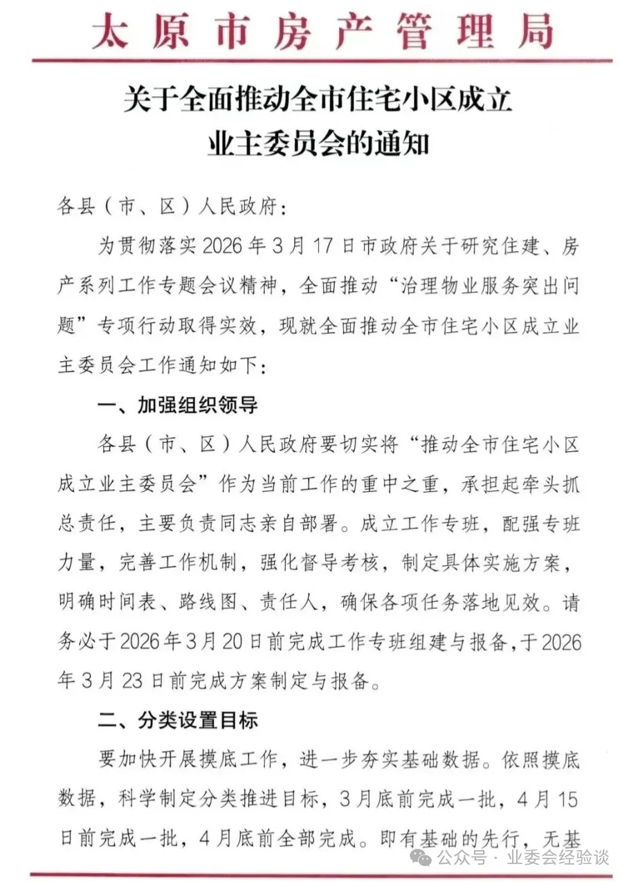 3 月 18 日,太原市房产管理局正式印发《关于全面推动全市住宅小区成立业主委员会的通知》,目标简单直接、态度强硬明确:全市所有住宅小区,必须在 2026 年 4 月底前,全面完成业主委员会成立工作,实现业委会全覆盖!