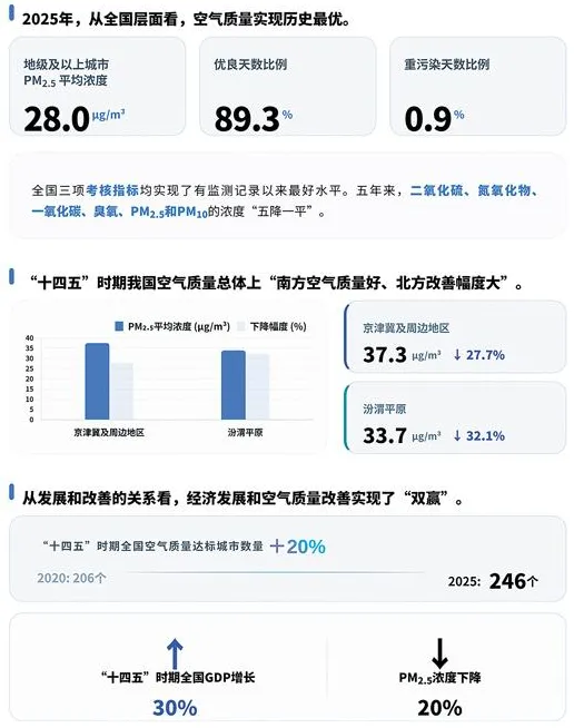 一系列技术突破和改造举措落地见效,太原交出了理想的成绩单。经过国家环境监测总站审核,2025年,太原市区优良天数282天,优良率为77.3%,优良天数比上年增加34天。太原市区环境空气质量综合指数为4.13,同比下降12.8%,实现“六年连降”。六项污染物浓度实现“四降两平”,除臭氧外其余五项达国家二级标准,各项指标创有监测以来最优水平。“