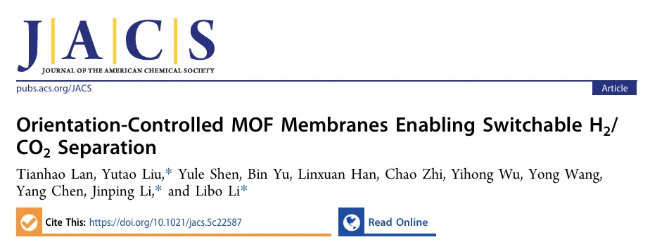 太原理工大学李立博教授、李晋平教授、刘玉涛博士通过开发一种无晶种的液相-气相沉积策略,制备了高度(112)取向的超薄KAUST-7膜,并与通过二次生长法制备的(001)取向膜对比,首次实现了仅通过调控晶体取向即可在单一MOF材料中可逆切换H2/CO2分离选择性。相关工作发表在Journal of The American Chemical Society (JACS)。