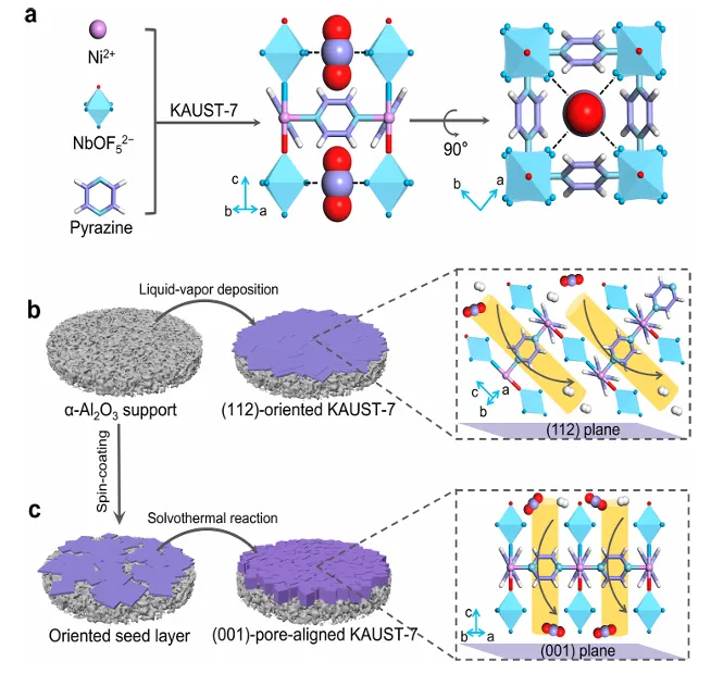 (a) KAUST-7的晶体结构,展示其沿c轴的一维超微孔通道(~0.32 nm)及孔壁上的NbOF₅²⁻氟吸附位点。(b) 通过液相-气相沉积(LVD)策略制备的(112)取向KAUST-7薄膜示意图及其预期的H₂选择性。(c) 通过二次生长法基于(001)取向纳米片种子制备的(001)取向KAUST-7膜示意图及其预期的CO₂选择性。