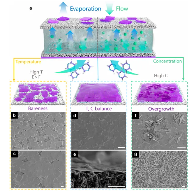 (a) LVD过程示意图(左)及关键参数(温度、前驱体浓度)对膜形成影响的示意图(右)。(b-g) 在不同合成条件下(温度、前驱体浓度)所得样品的扫描电镜俯视图:(b) 80°C, 0.01 g/mL,基底上离散的方形纳米片;(c) 80°C, 0.015 g/mL,纳米片覆盖度增加但仍不连续;(d, e) 60°C, 0.01 g/mL,形成连续、均匀的超薄膜(厚度约200 nm);(f) 60°C, 0.015 g/mL,表面出现纳米片团聚和突起;(g) 60°C, 0.03 g/mL,被随机排列的片状晶体完全覆盖。