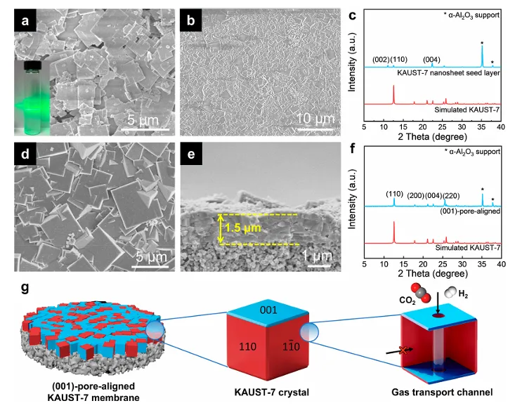 (a) (001)取向KAUST-7纳米片种子的扫描电镜图。(b) 通过旋涂法沉积在载体上的种子层扫描电镜图。(c) 种子层的X射线衍射图谱。(d, e) 二次生长后得到的连续、致密KAUST-7膜的扫描电镜俯视图和截面图(厚度约1.5 μm)。(f) 所得膜的X射线衍射图谱。(g) 基于XRD结果推测的(001)取向膜中晶体排列示意图。