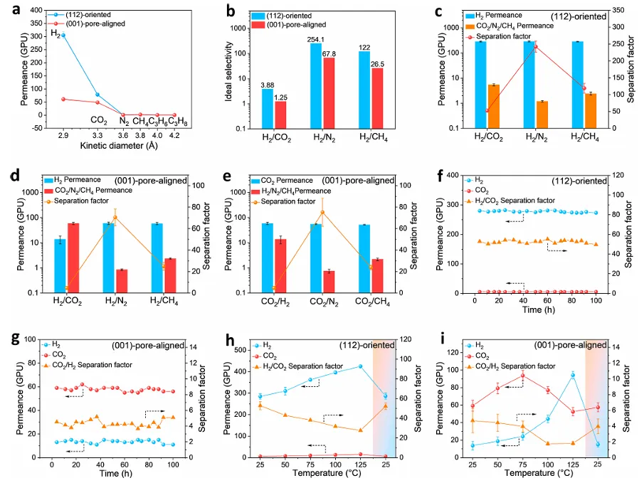 (a, b) (112)取向和(001)取向KAUST-7膜对H₂, CO₂, N₂, CH₄的单组分气体渗透性能对比。(c, d) 两种膜对等摩尔H₂/CO₂, H₂/N₂, H₂/CH₄混合气体的分离性能(分离因子)对比,显示(112)取向膜H₂/CO₂选择性高达52.7,而(001)取向膜CO₂/H₂选择性为4.7,性能完全反转。(e) (001)取向膜对CO₂/N₂和CO₂/CH₄混合气体的分离性能。(f, g) 两种膜在连续100小时H₂/CO₂混合气测试中的长期稳定性。(h, i) 两种膜的H₂和CO₂渗透率随温度(25-125°C)变化的趋势,揭示了不同的主导传输机制(熵驱动 vs. 焓驱动),且性能变化可逆。