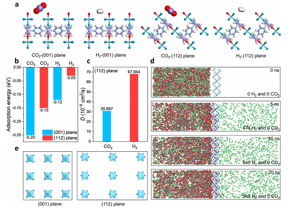 (a, b) 密度泛函理论计算得到的CO₂分子在KAUST-7的(001)和(112)晶面上的吸附构型与吸附能,显示(001)面吸附更强(-0.25 vs. -0.15 eV)。(c) 分子动力学模拟得到的H₂和CO₂在(112)取向KAUST-7模型中的均方位移曲线,用于计算扩散系数。(d) 分子动力学模拟的初始与最终状态快照(使用VMD软件绘制),直观展示H₂(绿色)和CO₂(红色)分子在模型中的分布与透过情况。(e) (001)和(112)晶面原子排列及NbOF₅²⁻吸附位点密度差异示意图,解释了吸附性能差异的起源。