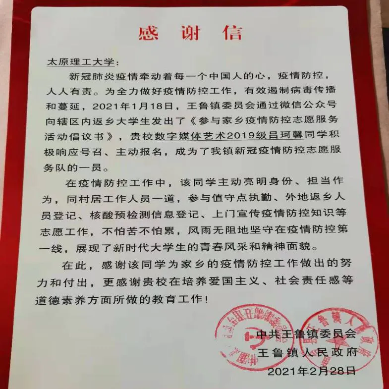 数媒1901吕珂馨参与到社区志愿服务中,为大家普及信息收集的重要性、帮助不会用智能手机的老年人成功登记信息、帮助镇团委组织大家参观当地新时代文明实践中心,并收到了当地政府的感谢信。