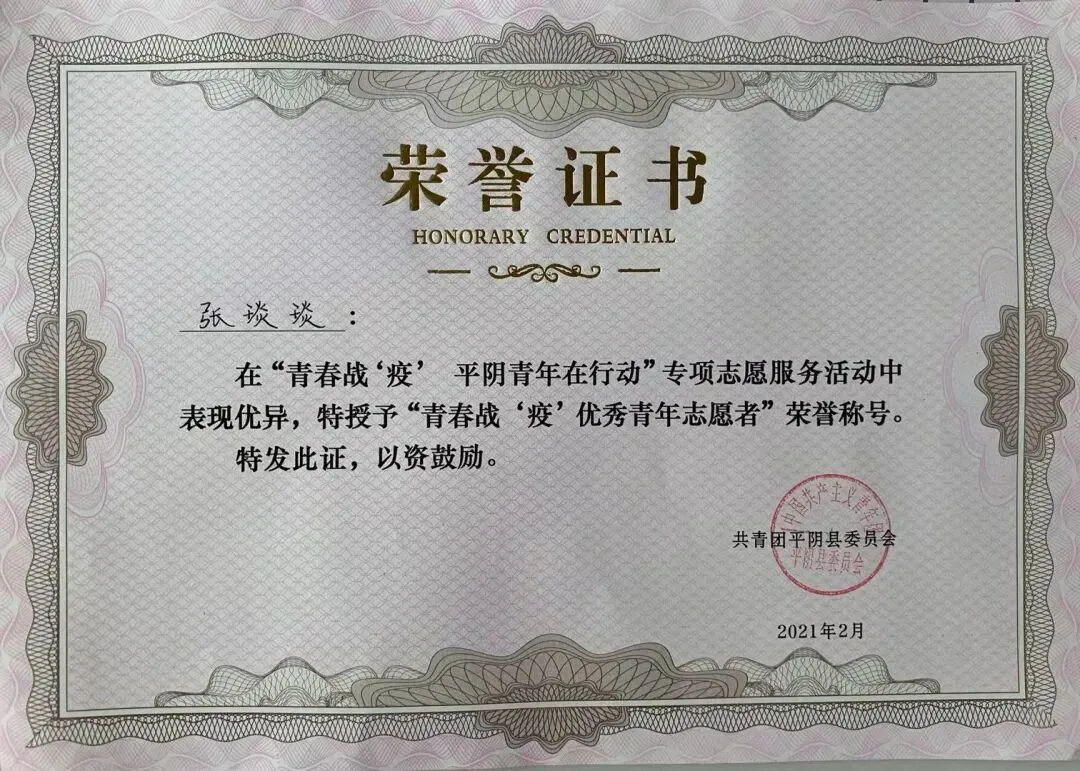 研究生张琰琰,积极参与到“青春战‘疫’平阴青年在行动”专项志愿服务活动中,获得“青春战‘疫’优秀青年志愿者”荣誉称号,并收到了共青团平阴县委员会设计宣传顾问的聘书。