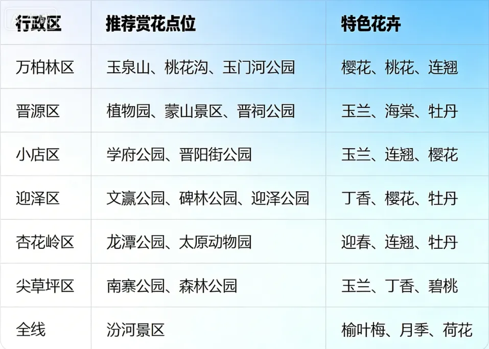 万柏林区玉泉山、桃花沟的樱花与桃花粉黛满枝;晋源区植物园、蒙山景区的玉兰、海棠清雅动人;小店区学府公园、晋阳街公园的玉兰与连翘相映成趣;迎泽区文瀛公园、碑林公园的丁香与牡丹暗香浮动;杏花岭区龙潭公园、太原动物园的迎春与连翘率先报春;尖草坪区南寨公园、森林公园的玉兰与碧桃争奇斗艳;更有全线汾河景区的榆叶梅、月季次第盛开。