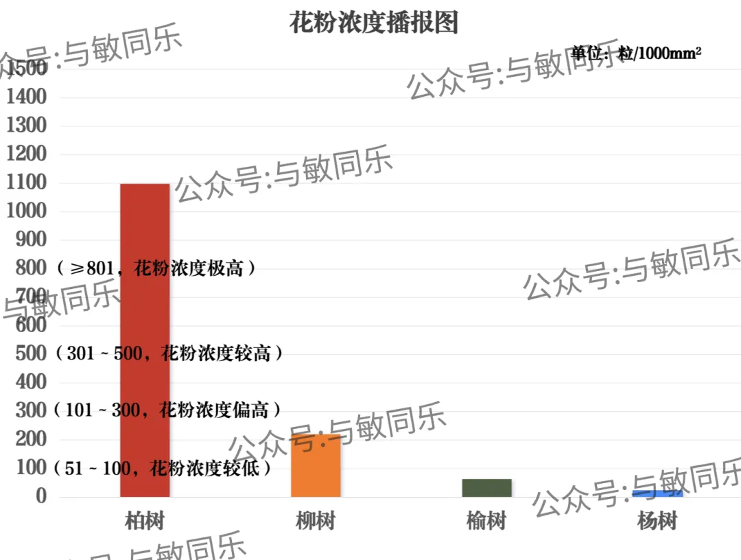 榆树花粉浓度为较低;杨树花粉浓度为很低。