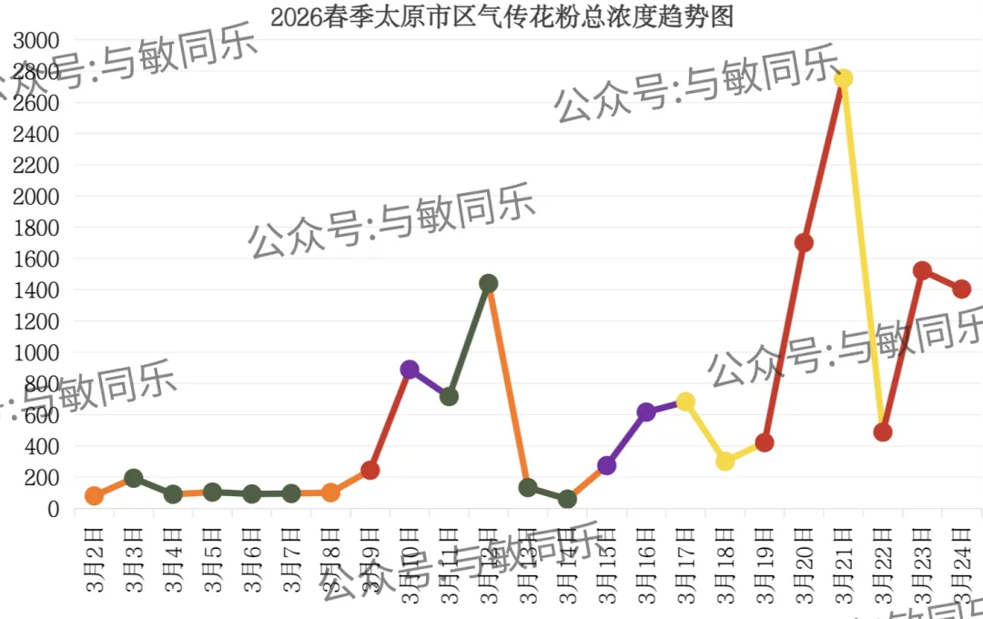 3月24日早8点至3月25日早8点:花粉总数≥801(粒/1000mm²),花粉总浓度为六级(花粉浓度极高)。