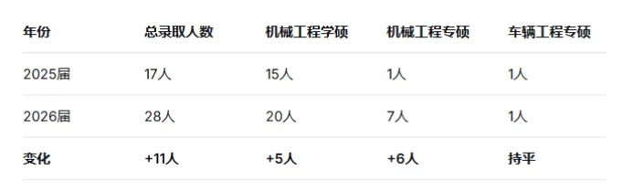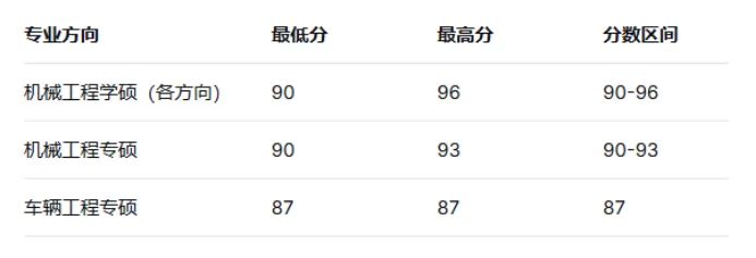 2025届复试成绩范围74-93分,最低分74分(支教团专项);2026届范围87-96分,最低分87分(车辆专硕),最高分96分(机械学硕)。整个分数区间上移了十几分,说明进来的生源整体更强了——外校生多了,竞争自然就上去了。