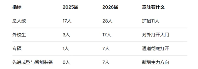 这是两年数据里最值得关注的变化。2025届本校生占82.4%,外校生只有3人;2026届外校生冲到17人,占比超过60%,本校生反而降到11人。这不是简单的名额调整,是招生逻辑在变——太原理工机械,正在对外打开大门。
