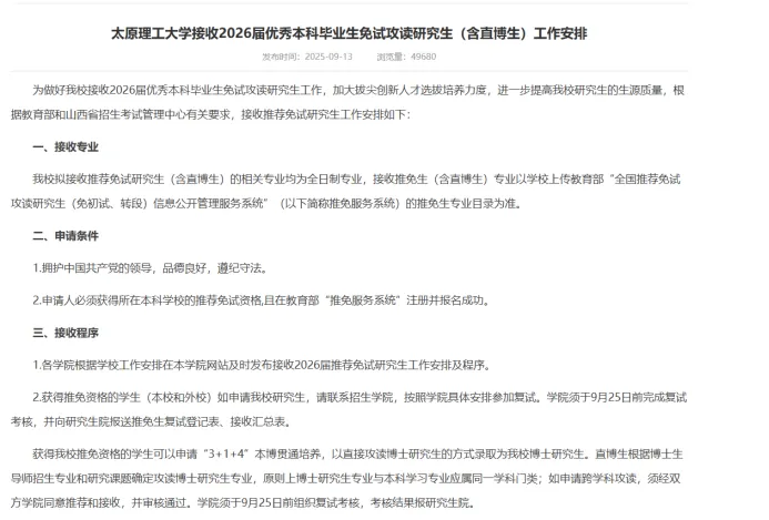 机械保研er看过来!太原理工大学机械工程作为山西唯一双一流+ 211的工科王牌,背靠煤炭能源基地,在矿山机械、先进成形与智能装备等方向特色鲜明,近两年推免扩招红利显著、外校友好度拉满,无明显院校歧视,不管是本校生、985/211生源,还是有实力的双非同学,都能找到适配的上岸路径。本文整合太理机械 2025-2026年最新拟录取数据,从扩招趋势、生源结构、报考策略多维度拆解干货,帮你精准把握黄金窗口期,高效备战稳上岸!