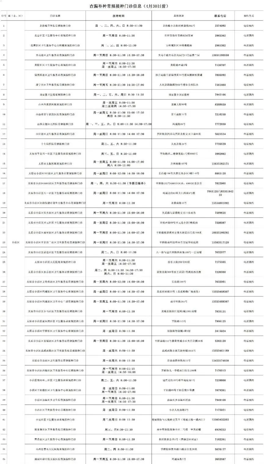 为进一步提高免疫规划疫苗接种覆盖率,筑牢免疫屏障,按照全省统一部署,太原市正在开展免疫规划疫苗查漏补种专项行动。现集中公布我市开展免疫规划疫苗查漏补种常规接种门诊名单,方便市民就近补种疫苗、补录信息。