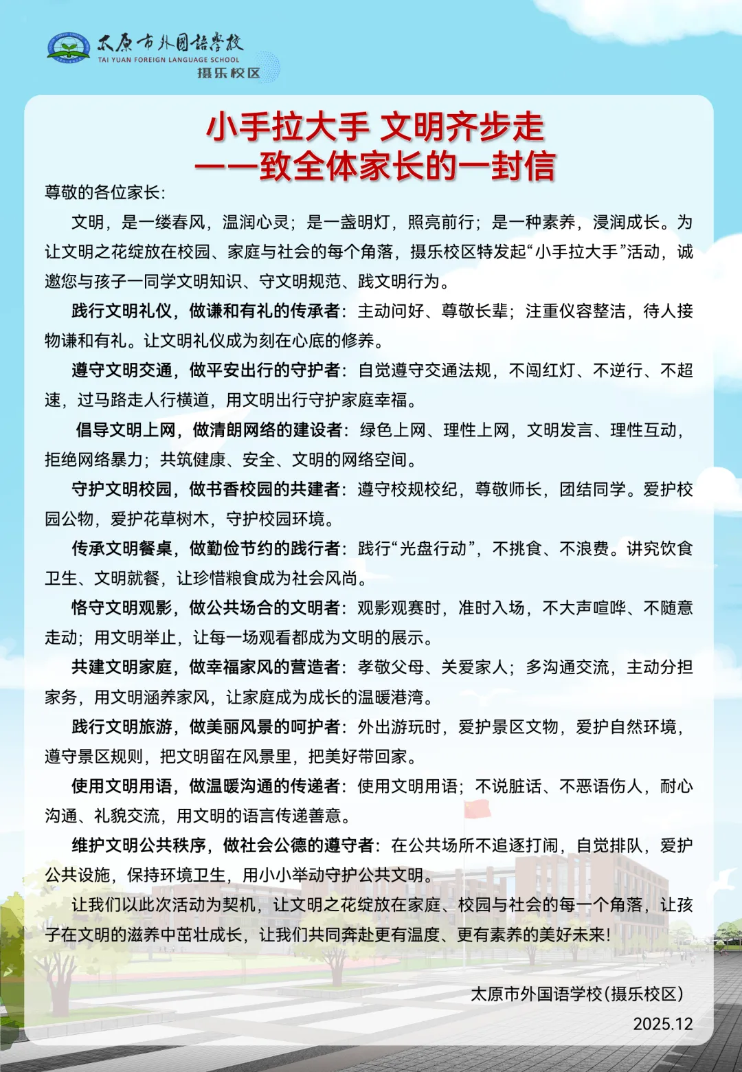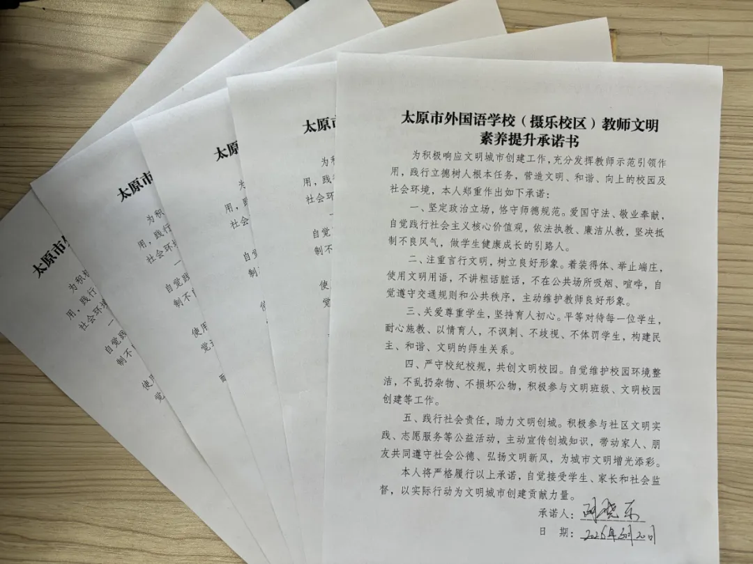 文明薪火,生生不息;育人之路,步履不停。在太原市外国语学校(摄乐校区),文明不仅是一种理念,更是一种行动;不仅是一种规范,更是一种习惯。摄乐校区,将继续以文明校园为基石,深耕细作、久久为功,让文明之花常开不谢,让礼仪之风浸润校园,培育德智体美劳全面发展的时代新人,让文明成为校园最靓丽的名片!