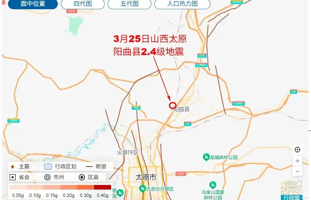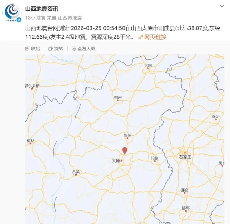 据测定2026年3月25日00时54分在山西太原市阳曲县发生2.4级地震,震源深度为28千米。本次地震是自2026年3月23日山西太原市小店区2.6级地震山西太原境内3天内发生的第二次地震。2026年3月25日山西太原市阳曲县2.4级地震位于系舟山山前断裂带和亲贤-新城断裂和山根底断裂之间。本次地震和2026年3月23日山西太原市小店区2.6级地震之间并无关联性。【2026年3月23日山西太原市小店区2.6级地震位于交城断裂带和田庄断层和汾河断层交界区域附近】系舟山山前断裂带南起自太原阳曲县,经忻州市,定襄县,五台县,向东北方向一直延伸至五台山景区附近,全长约120余千米。亲贤-新城断裂南起自太原市小店区,经太原市迎泽区,杏花岭区,向北一直延伸至阳曲县以西,全长约40余千米。山根底断裂西南起自太原市尖草坪区,向东北延伸至阳曲县西北,全长约25千米。山西太原境内【包括太原市和太原下辖县】共分布着10条地震断层或地震断裂带,其中太原市市区分布着交城断裂带,山根底断裂,汾河断层,田庄断层,亲贤-新城断裂,东山山前断层,而太原阳曲县位于系舟山山前断裂带,太原娄烦县位于杏湾断裂,娄烦断裂,岚城断裂。【这些地震断层或地震断裂带均属于汾渭断裂带分支断层或分支断裂】历史上山西太原曾经发生过多次5级或5级以上地震,下列是山西太原境内历史上5级或5级以上地震记录。144年10月25日山西太原以北发生5.5级地震。712年2月19日山西太原-汾阳发生5.5级地震。1342年5月13日山西太原南部发生5.5级地震。1554年6月5日山西太原-大同之间发生5级地震。初步分析研判认为2026年3月23日山西太原市小店区2.6级地震和2026年3月25日山西太原市阳曲县2.4级地震均属于汾渭断裂带上正常应力释放。结合目前收集前兆分析研判近期山西太原市境内不会发生4.5级或4.5级以上地震,发生4级至4.4级地震概率极低。