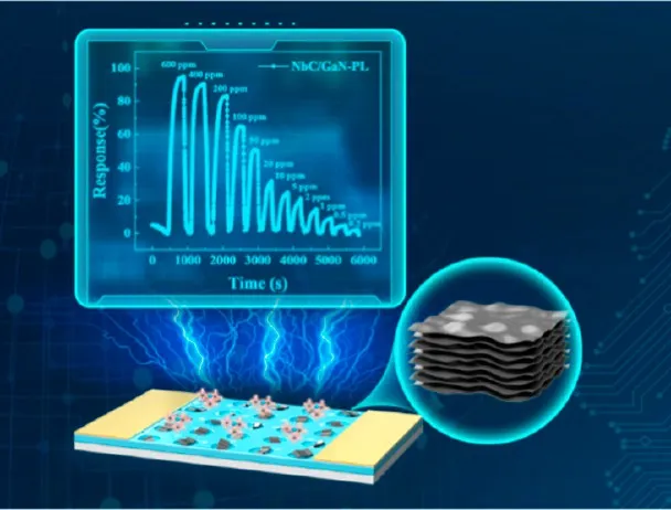 异质结协同增强:p型NbC与n型GaN形成p-n异质结与肖特基势垒,显著提升气体吸附与电荷传输效率;