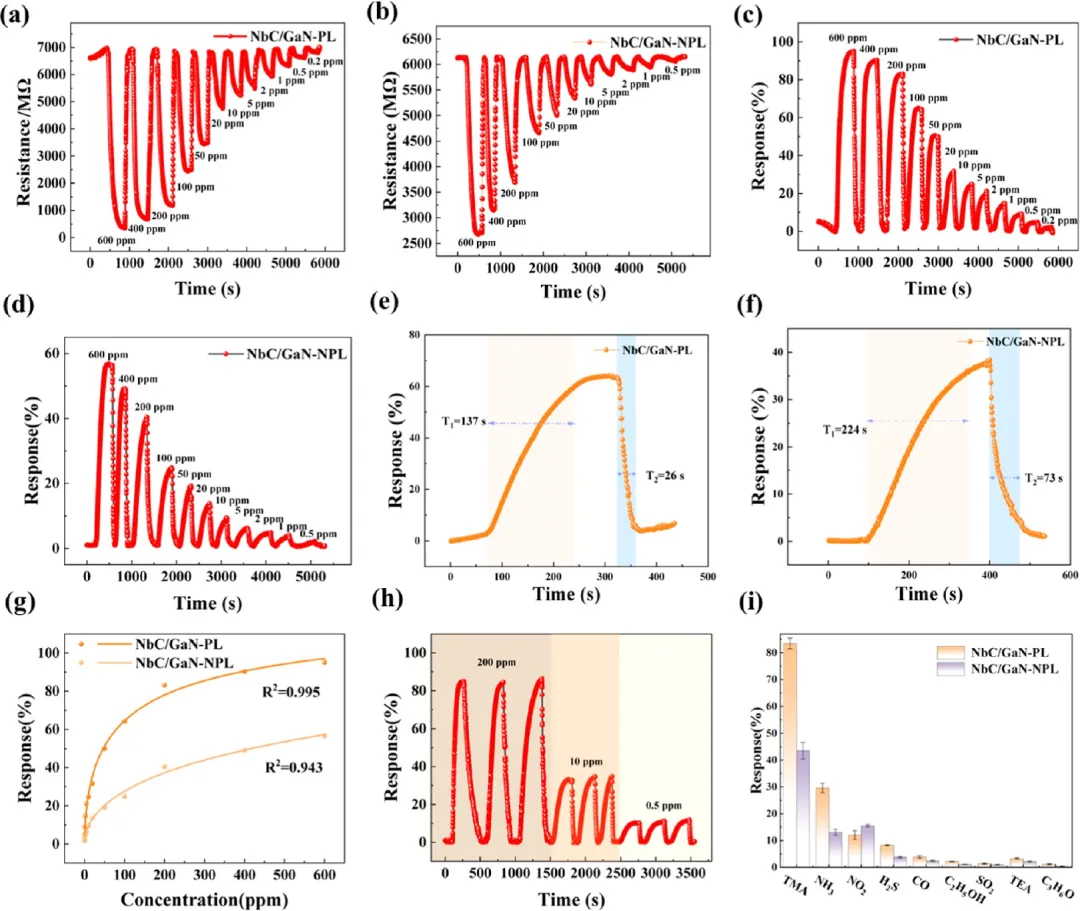 (a) NbC/GaN-PL传感器和(b) NbC/GaN-NPL传感器在室温下对不同浓度TMA的电阻曲线。(c) NbC/GaN-PL传感器和(d) NbC/GaN-NPL传感器对不同浓度TMA的响应曲线。(e) NbC/GaN-PL传感器和(f) NbC/GaN-NPL传感器对100 ppm TMA的响应和恢复时间。(g) NbC/GaN-PL传感器和NbC/GaN-NPL传感器的拟合响应曲线。(h) NbC/GaN-PL纳米薄膜传感器对200 ppm、10 ppm和0.5 ppm TMA的重复性;(i) NbC/GaN-PL传感器和NbC/GaN-NPL传感器对浓度为200 ppm的不同气体的选择性。