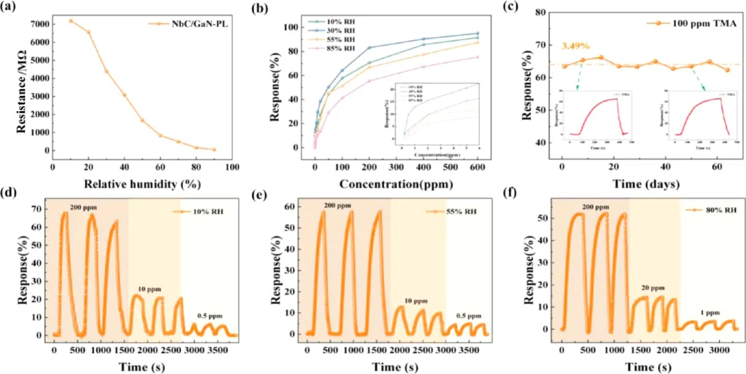 (a) 室温下相对湿度(RH)对NbC/GaN-PL纳米薄膜传感器电阻的影响。(b) 室温下不同RH下NbC/GaN-PL纳米薄膜传感器对不同浓度三甲基胺(TMA)的响应。(c) 室温下NbC/GaN-PL纳米薄膜传感器对100 ppm TMA的长期稳定性。(d−f) 在10%、55%和80%相对湿度下,NbC/GaN-PL纳米薄膜传感器对不同浓度TMA气体的重复性。