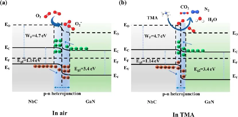 传感器的优异性能源于 p 型 NbC 与 n 型 GaN 形成的p-n 异质结和肖特基势垒的协同作用: