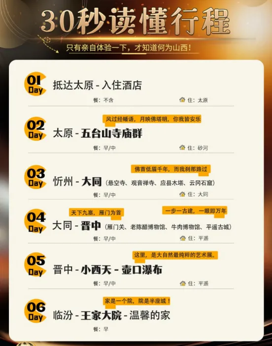 【温馨提示:平遥古城、五台山等地区住宿地为景区内,多为居民所建,房间条件有限,如给您带来不便,敬请见谅】1. 餐食须知旅游团队用餐,旅行社按承诺标准确保餐饮卫生及餐食数量,但不同地区餐食口味有差异,不一定满足您的口味需求,敬请谅解!