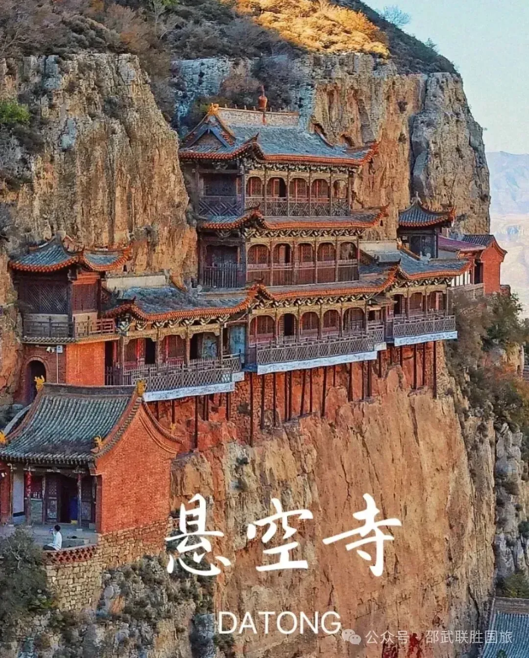 距今一千五百多年,整片建筑就像悬挂在悬崖上、如临深渊的险峻。所以这里是恒山悬空寺。