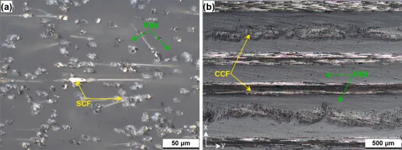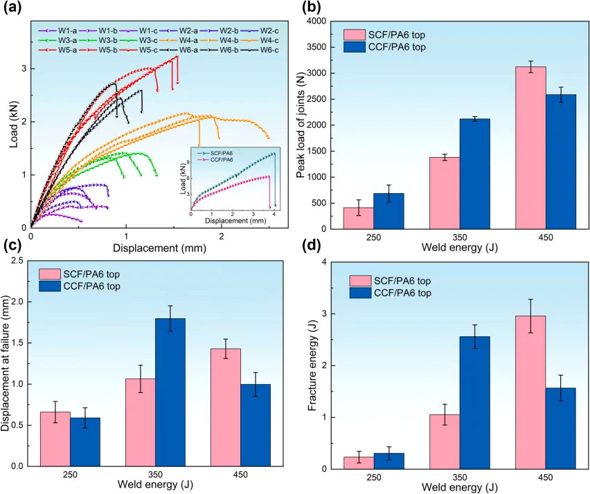 2025年9月,太原理工大学张婷婷团队在《Journal of Manufacturing Processes》上发表了《Ultrasonic spot welding of dissimilar short- and continuous-fiber reinforcedPA6 composites: Fiber redistribution, porosity formation, and jointstrengthening mechanisms(异种短纤维与连续纤维增强PA6复合材料超声波点焊:纤维再分布、孔隙形成及接头强化机制)》一文。DOI:https://doi.org/10.1016/j.jmapro.2025.09.078随着高性能轻质结构材料在航空航天、交通运输及国防工业的广泛应用,纤维增强热塑性复合材料(FRPCs)因其高比强度、优良的可加工性和可回收性而受到关注。碳纤维增强聚酰胺6(CF/PA6)作为代表性热塑性复合材料,兼具刚性与韧性,在结构件制造中潜力巨大。然而,不同纤维形态(短纤与连续纤维)对成型与连接性能的影响机制仍不清晰。传统的机械紧固和胶接技术虽可实现连接,但存在应力集中、重量增加、耐久性差和拆卸困难等问题。相比之下,超声波焊接(Ultrasonic Welding, USW)以其能耗低、加热快、热影响区小、适合自动化的优点,成为连接热塑性复合材料的理想方案。尤其是在无能量导向层的条件下,USW可直接实现纤维增强复合材料的快速熔接。然而,现有研究主要集中于单一纤维体系(仅短纤或连续纤维),对异种纤维体系(短纤/连续纤维)的焊接行为、界面演化与缺陷形成机制缺乏系统认识。短纤维复合材料流动性好、适应性强;而连续纤维复合材料刚度高、导热性强,两者在超声波焊接中的热力响应显著不同。作者针对这一空白,提出利用USW实现短纤增强PA6(SCF/PA6)与连续纤增强PA6(CCF/PA6)的搭接连接,并系统研究纤维重分布、孔隙形成及界面强化机理。实验采用厚度均为2 mm的SCF/PA6与CCF/PA6板材。短纤复合板通过压模成型制备,连续纤复合板则为商用叠层预浸料,经热压固化而成。两者的熔融温度相近(约213–215°C),确保界面热兼容性。焊接能量分别为250、350和450 J,采用能量控制模式,振幅100 μm,焊接压力100 N。所有样品经光学显微(OM)、扫描电镜(SEM)、傅里叶红外光谱(FTIR)、界面温度监测及单搭剪切测试综合表征。图1复合材料横截面形态:(a)SCF/PA6;(b)CCF/PA6图2 超声波焊接设置:(a)超声波焊接工艺示意图;(b)顶侧配置SCF/PA6;(c)顶侧配置CCF/PA6在低能量(250 J)时,界面熔融层薄,纤维迁移有限。短纤上板(W1)中界面致密、几乎无孔;而连续纤上板(W2)则出现微孔,说明连续纤限制了熔体流动与热传导。当能量增至350 J,短纤板内熔体流层厚度显著增大(约86.8 μm),短纤在声致流动中向界面迁移,与连续纤交错形成复合增强区;而连续纤上板时,界面温升高但纤维嵌入有限,熔融树脂外溢,孔隙集中于界面中央。高能量(450 J)下,短纤体系出现明显纤维团聚和气孔扩展,连续纤体系则因刚性回弹造成界面脱层。整体趋势表明:短纤板在上有利于纤维-树脂混合与界面致密化,而连续纤板在上则易产生热降解和孔隙聚集。PA6基体的特征峰(C=O, N–H, CH₂)随焊接能量升高逐渐减弱,说明高能量导致部分聚酰胺链断裂或脱氢反应。尤其是碳酰基吸收峰(1640 cm⁻¹)显著降低,表明过度加热引起的热降解与交联反应,印证了孔隙生成与界面退化现象。图3 450J焊接能量下接头的横截面形貌:(a)W5整体视图;(b)–(d)局部放大视图;(e)W6全景图;(f)–(h)局部放大视图剪切测试结果显示,随着能量提高,接头强度总体提升,但堆叠顺序影响显著。短纤上板(W5)在450 J时达到最大载荷3122 N,比连续纤上板(W6)高17%,对应母材强度的约50%。断裂能随能量提升持续增加,表明焊缝韧性增强。图4 不同能量输入下焊接接头的力学性能:(a)载荷-位移曲线;(b)峰值负荷;(c)断裂时的位移;(d)断裂能(a中的插图显示了原始板材的机械性能;断裂能定义为荷载-位移曲线下的面积)在高能量下,短纤迁移与连续纤交织形成的复合界面有效提升了载荷传递与能量吸收能力,而连续纤上板因树脂过度外流及微孔增多,导致强度提升有限。在低能量条件下,断口以树脂-树脂黏结破坏为主(Type I)。随能量提升,短纤逐渐参与承载,出现纤维/基体界面脱粘(Type II);至高能量时,裂纹主要在连续纤束间扩展(Type III),表现出多界面协同破坏特征。短纤的嵌入与桥联作用使裂纹路径弯曲,增强了断裂能与界面韧性。SEM观察揭示,短纤上板样品中可见连续纤断裂、短纤印迹及熔融树脂桥,显示出良好的机械互锁结构;而连续纤上板中孔隙沿纤维束扩展,易导致剥离与分层。图5 450 J焊接接头的宏观和SEM断口形貌:(a–c)W5顶板;(d–f)W5的底板;(g–i)W6顶板;(j-l)W6的底板低能量阶段:界面以树脂结合为主,强度低;中能量阶段:短纤迁移进入界面,形成机械嵌锁与裂纹偏转,提升韧性;高能量阶段:连续纤束间形成复合载荷区,短纤桥接作用显著,促进裂纹分支与能量耗散。这一“多尺度协同承载结构”兼具短纤的塑性与连续纤的刚度,实现了界面强度与延展性的平衡。图6 异种纤维接头的界面失效机理:(a)失效模式分析;(b)接缝加固机制示意图堆叠顺序显著影响焊接行为:短纤上板能获得更好的界面融合与力学性能;孔隙形成与能量密度密切相关:适度能量有助于界面扩散,过高则引起热降解;断裂模式呈序列演变:从基体内聚破坏向纤维-基体脱粘再到纤维间断裂过渡;短纤迁移与连续纤交织形成的复合界面是强度提升的核心机制;本研究为异种增强热塑性复合材料的结构化焊接设计提供了理论基础与工艺参考。