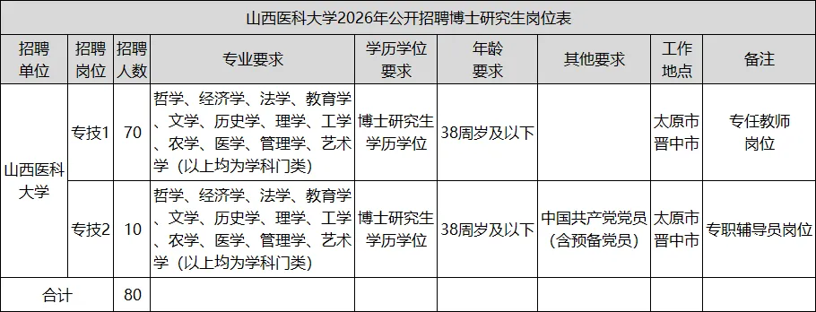 💡 山西医科大学招聘博士研究生80人