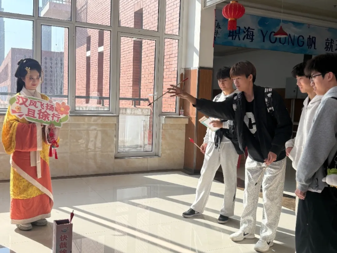 彭城七里文创展销区,“行走的徐州”文创、“华裳七里”汉服等特色产品备受青睐,文旅综合服务区内,徐州旅游地图、景区门票优惠券免费发放,工作人员耐心解答师生的咨询。汉风投壶游戏前排起长队,同学们手持箭羽体验传统游戏,现场欢声笑语不断。