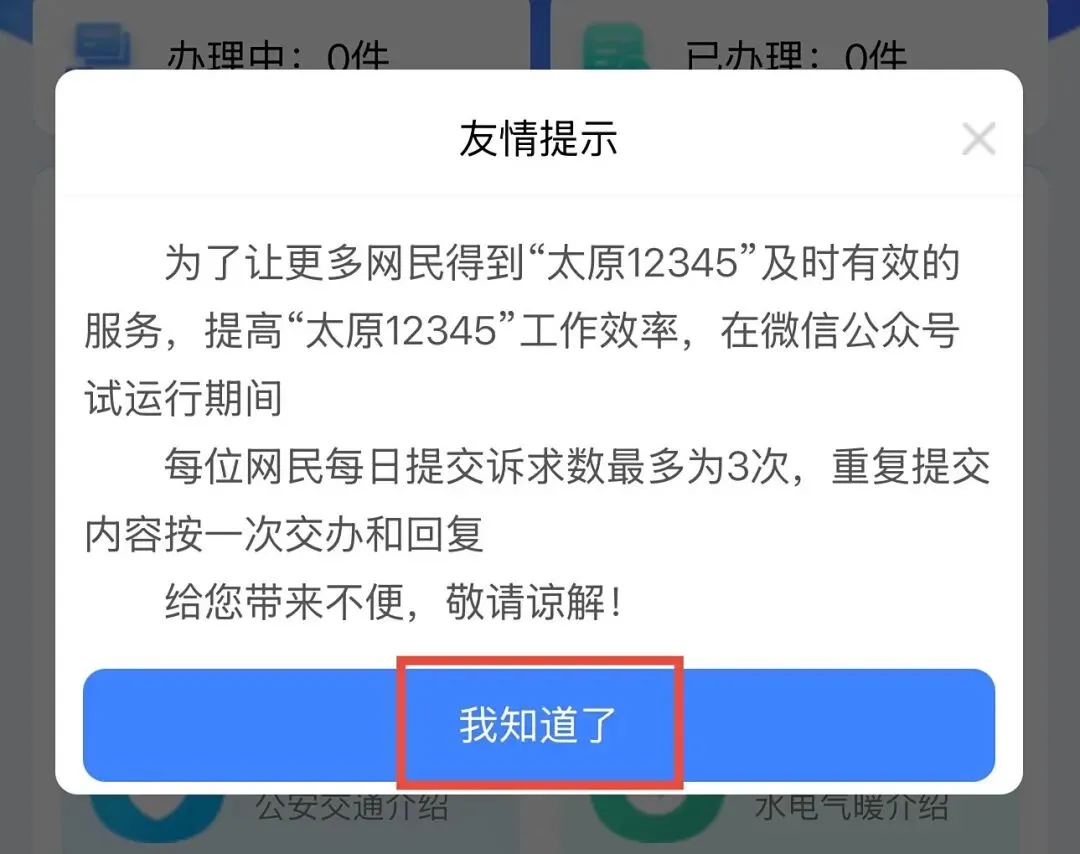 ✅第三步:系统自动弹出“友情提示”,阅读完成后,点击“我知道了”。