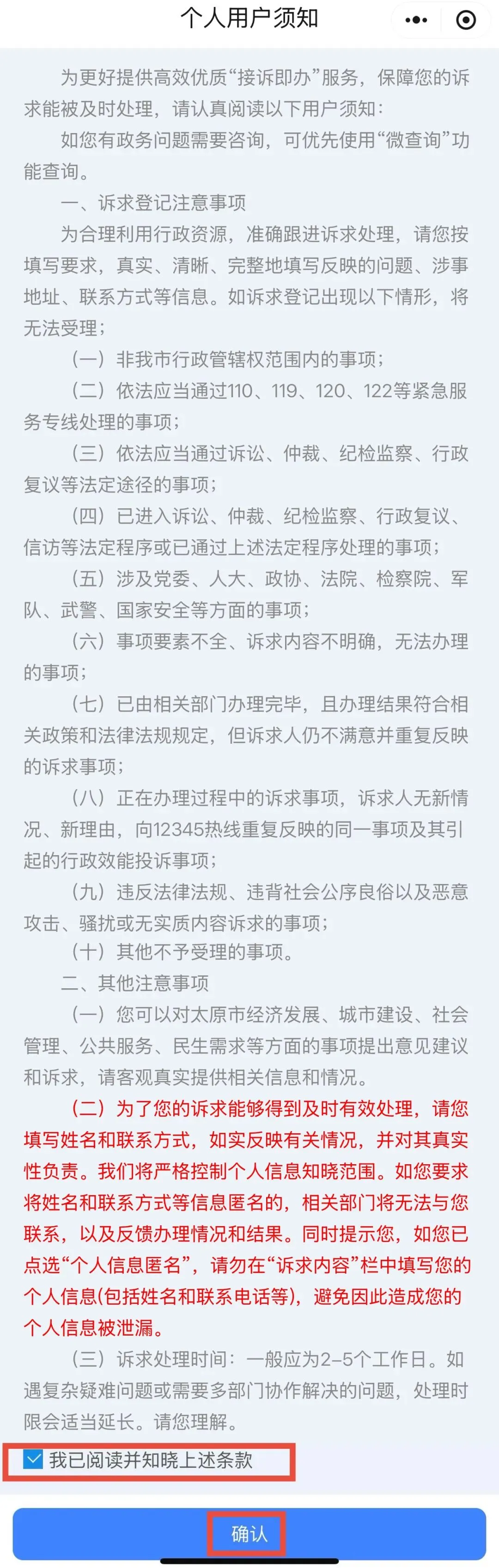 ✅第四步:系统自动弹出“个人用户须知”,阅读完成后,先勾选“我已阅读并知晓上述条款”,再点击“确认”。