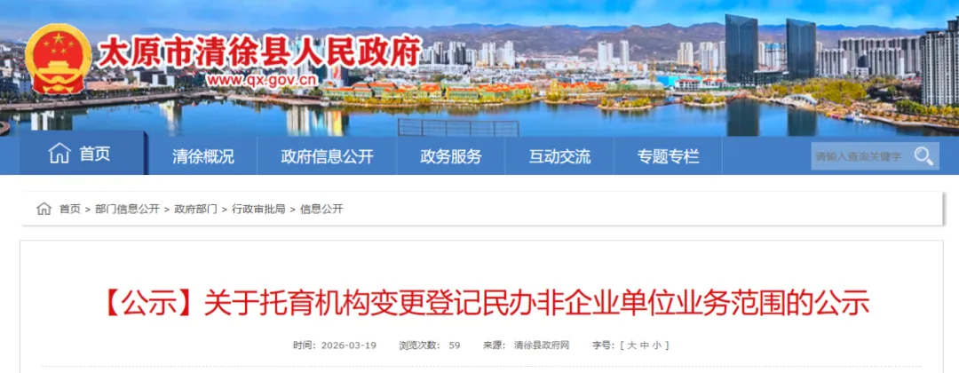 根据《关于印发〔托育机构登记和备案实施细则(试行)〕的通知》(晋卫发〔2020〕7号)“第十三条 卫生健康、机构编制、民政、市场监督管理、行政审批部门应当将托育服务有关政策规定、托育机构登记和备案要求、已登记或备案的托育机构有关信息及时在官方网站公开,接受社会查询和监督。”要求,现将符合民办非企业单位业务范围变更登记要求,增加业务范围“托育服务(3岁以下婴幼儿照护服务)”名单公布如下: