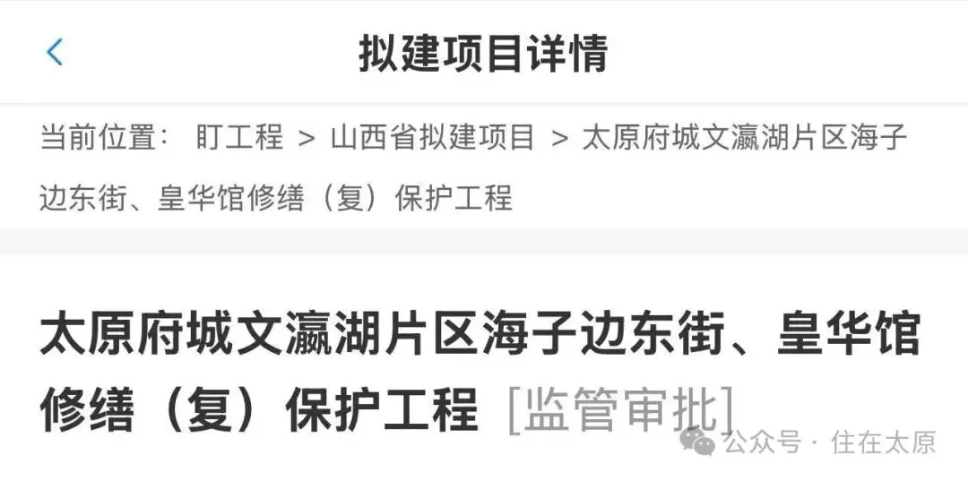 太原府城文瀛湖片区海子边东街,皇华馆修缮(复) 保护工程由太原市迎泽资产经营管理有限公司开发建设,总投资12亿元。