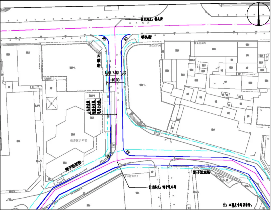 大濮府近期设计为城市支路,设计车速10公里/小时。远期为步行道。