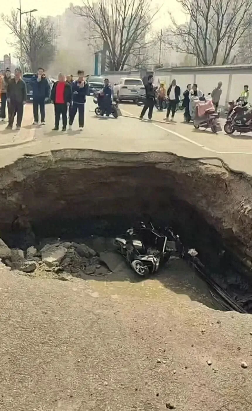3月25日,山西太原网友发视频,称大同路中冶天工对面道路塌陷,视频画面显示,有人连摩托车一同坠入。