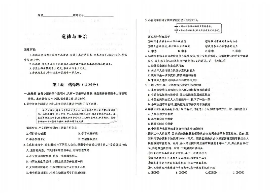 2026年山西太原市晋源区长兴南街学校等多校初三中考第一次模拟道德与法治试卷
