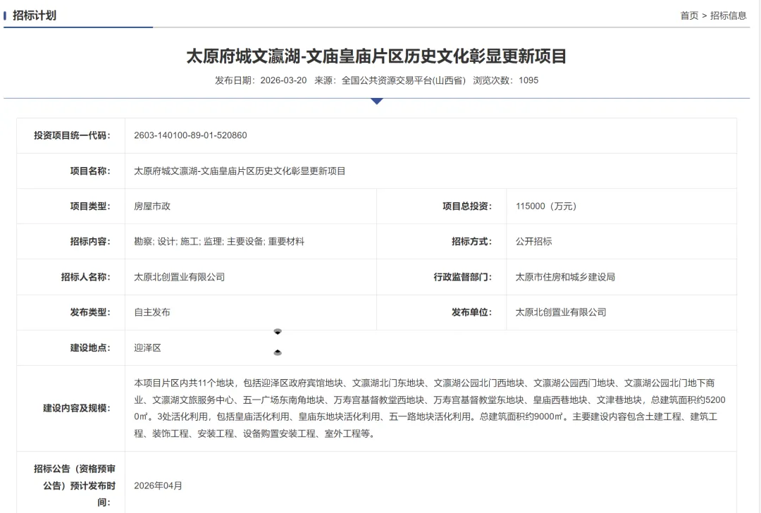 太原府城核心板块的复兴不仅是城市空间的更新,更是历史文脉的延续与现代活力的注入。随着文瀛湖-文庙皇庙片区历史文化彰显更新项目的深入推进,在“文化复兴+城市更新+产业赋能”三轮驱动下,这片承载着太原千年记忆的土地将焕发新生,成为全国老城保护更新的典范,为太原建设国家区域中心城市注入强劲的文化动力。