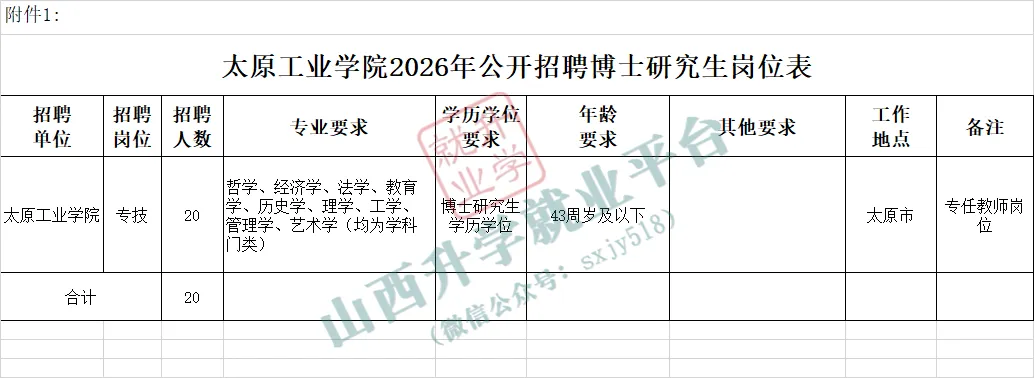 太原工业学院2026年公开招聘博士研究生20名,均为专业技术岗位。招聘岗位所需的具体条件以《太原工业学院2026年公开招聘博士研究生岗位表》(附件1)的要求为准。