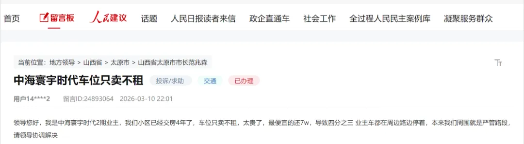 记者从人民网领导留言板获悉,网友反映太原市中海寰宇时代2期,小区已经交房4年了,车位只卖不租,四分之三的业主车都在周边路边停着。