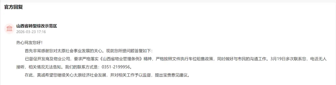 已督促开发商及物业公司,要求严格落实《山西省物业管理条例》精神,严格按照文件执行车位租售政策,同时做好与市民的沟通工作。