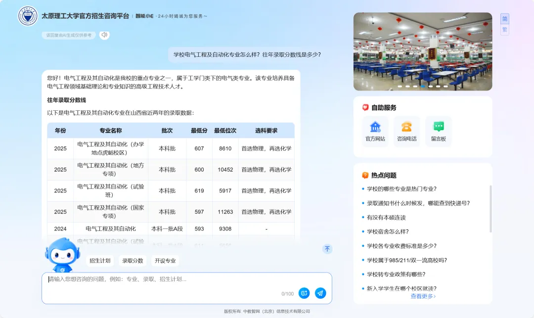 它还能轻松“接住”你一次性咨询的多个问题~比如你问 “学校电气工程及自动化专业怎么样?往年录取分数线是多少?”,它能精准读懂每一个疑问,智能整合相关信息,一次性逐条完整解答。不用反复拆分提问,不用多次等待回复,让同学们的每一个报考困惑,都能得到全面、清晰的回应。