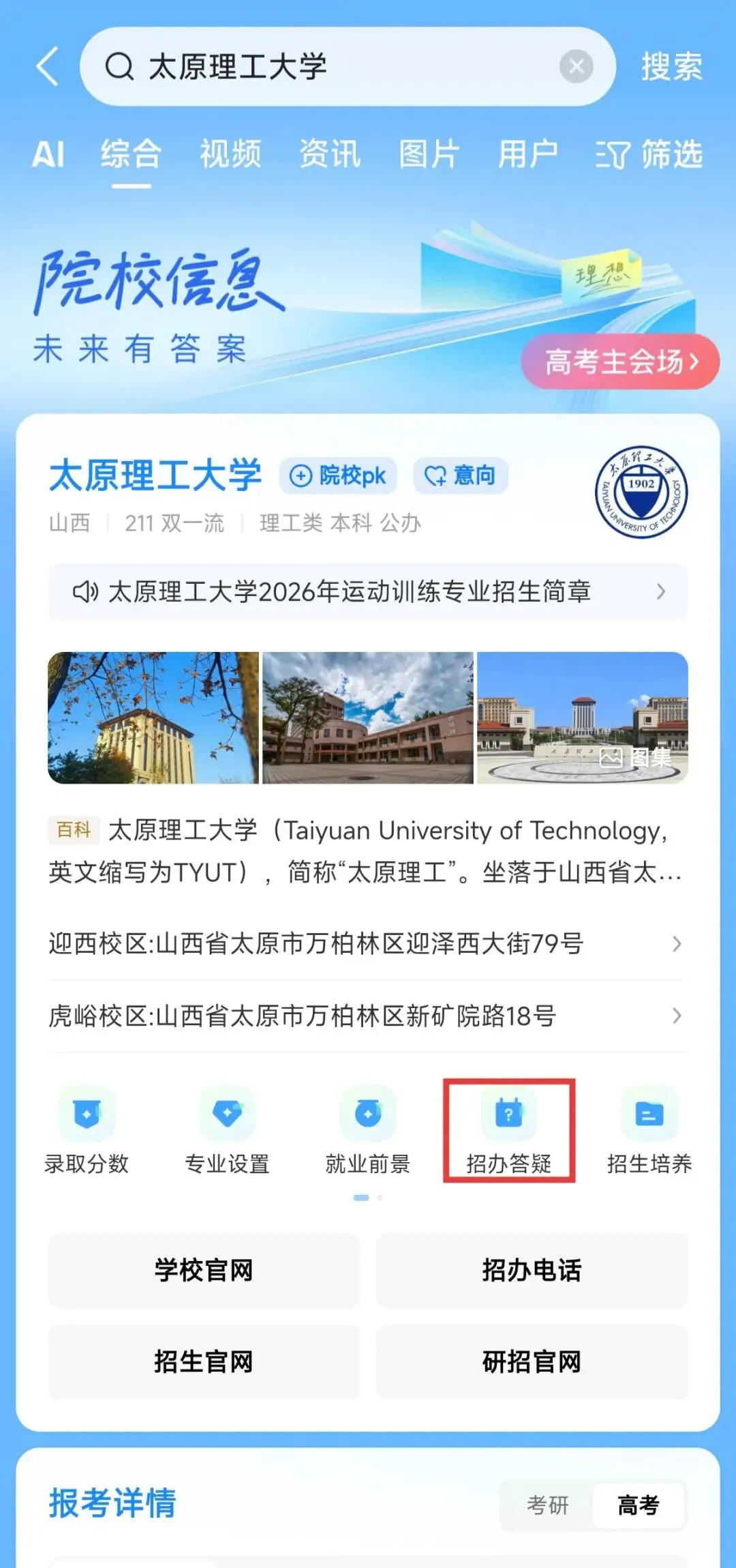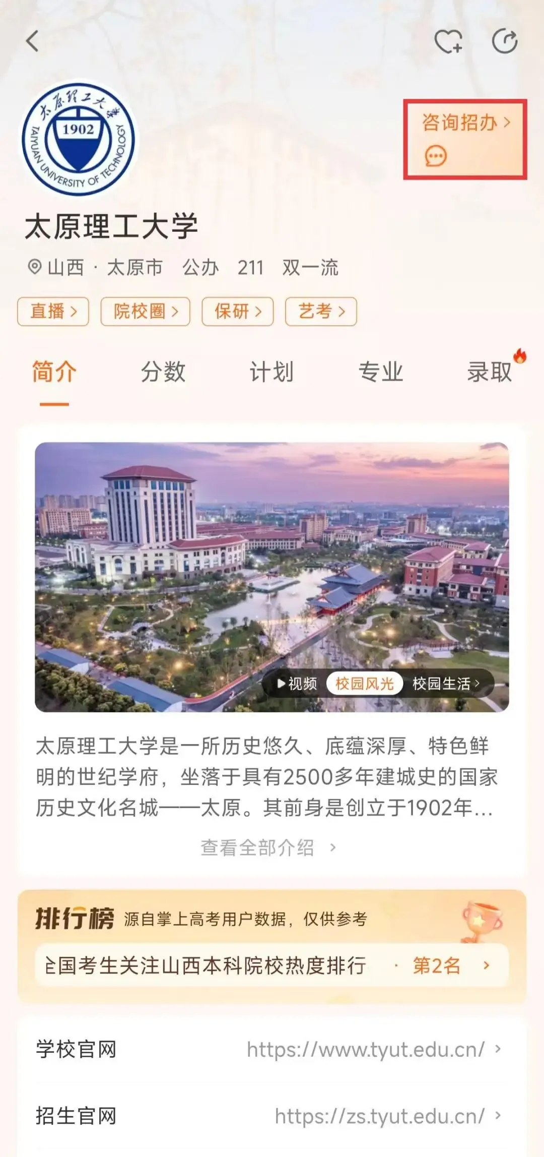 点击进入“太原理工大学本科招生”小程序主页