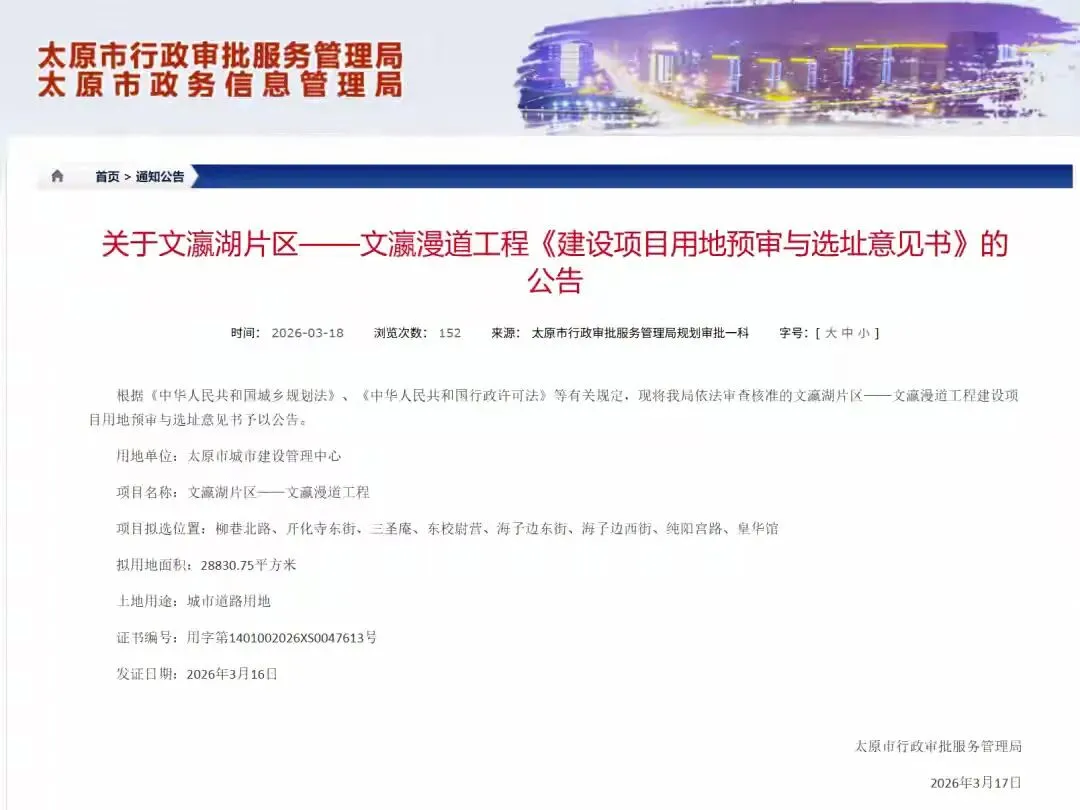 海子边最早可追溯到宋代的太原城护城壕,明代被纳入城中成为湿地,清代经治理后得名文瀛湖。上世纪八九十年代是海子边商业的黄金时代。这条仅 800 米的街道是太原的潮流心脏,买牛仔裤、听流行磁带、下馆子等都以这里为首选。然而,随着城市商业格局变迁、自身业态短板、电商冲击等多重现实问题叠加,这几年海子边不少店铺因生意惨淡被迫关门。2026年1月发布的《太原市城市更新专项规划(征求意见稿)》,规划期5年,明确府城片区、太重厂区、晋阳湖、两站一场为四大核心更新片区。其中府城片区重点项目包括“文瀛湖—海子边片区更新”,文瀛湖、皇华馆修缮复建,打造 “文瀛漫道”,将新建体验式商业街、地下停车场,联动五一广场、钟楼街、柳巷。近日,太原市行政审批服务管理局正式发布公告,文瀛湖片区——文瀛漫道工程获批用地预审与选址意见书,意味着大家盼了多年的海子边改造,终于要落地了!改造范围:环绕文瀛湖的8条街巷——柳巷北路、开化寺东街、三圣庵、东校尉营、海子边东街、海子边西街、纯阳宫路、皇华馆,拟用地约2.9万平方米。