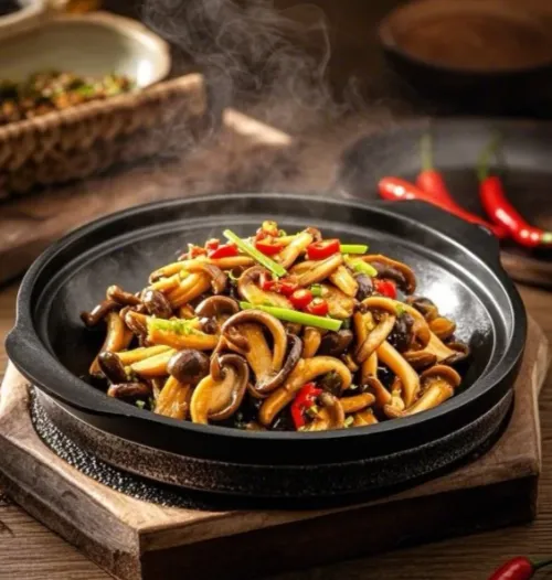 真要往山里走,庞泉沟附近那口鲜更不能错过。野生菌炒肉,讲究的不是什么花样,就是一个“鲜”字。蘑菇带着松林气,大火一翻,肉香和山气黏在一处,入口滑,后味又清,像把整片林子缩进一盘菜里。