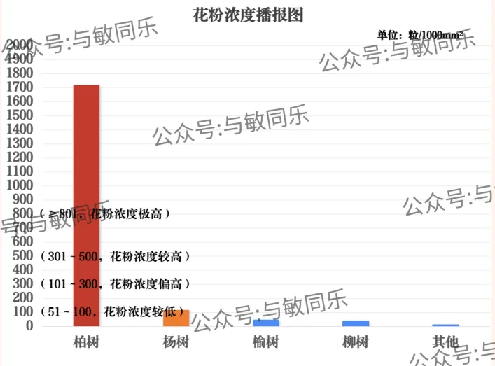 柏树花粉浓度为极高;杨树花粉浓度为偏高;