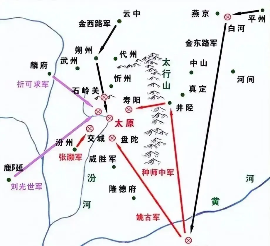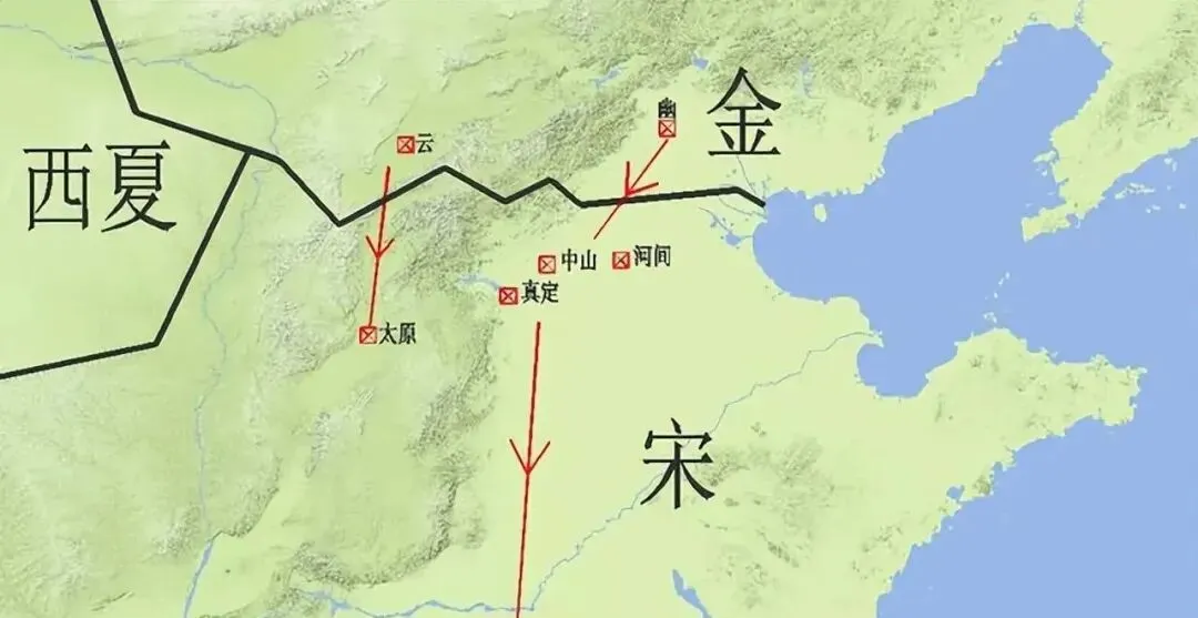 在金军南下的战略蓝图里,分兵两路:东路军打河北,西路军打山西。这两路大军最终的目的地都是汴京,意图形成钳形攻势,一举合围。