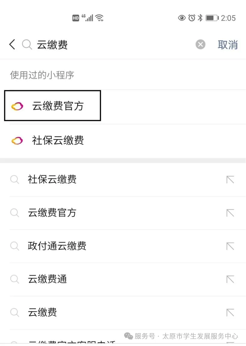 第二步:输入关键字“云缴费”,点击进入小程序“云缴费官方”
