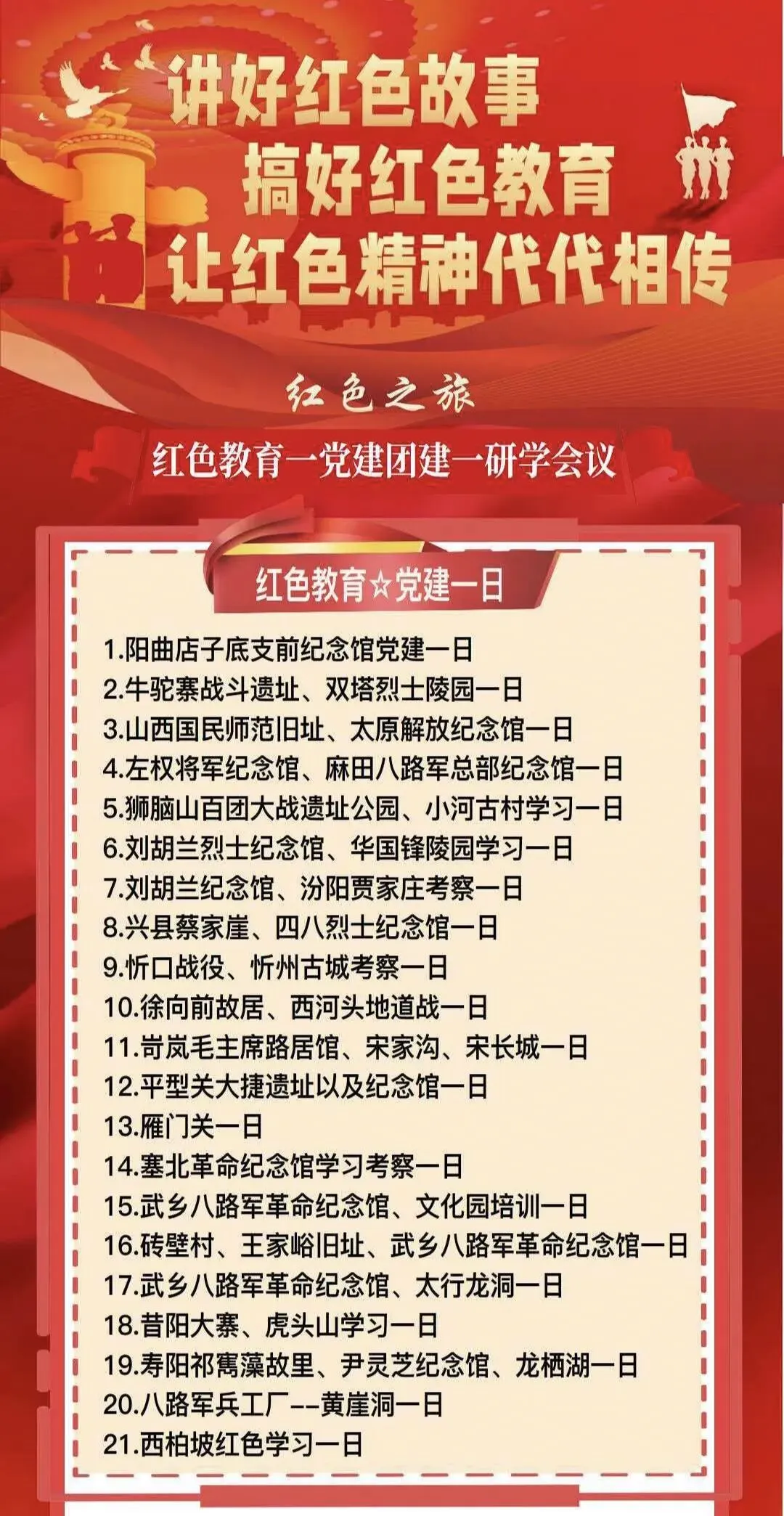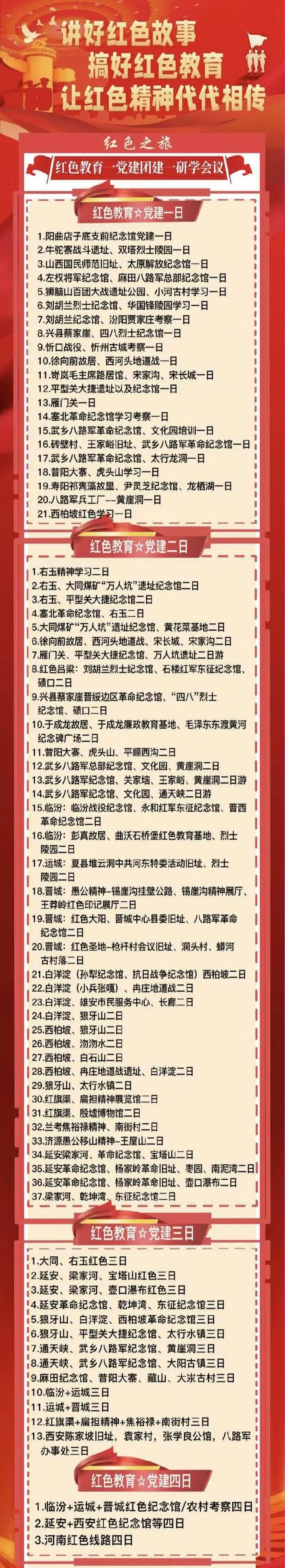 一年一度的研学热潮来袭!山西商务国旅周周深耕红色教育领域,专业承接各类大型研学、党建团建、研学会议活动,覆盖山西及周边经典红色点位,从一日短途到多日长线,按需定制专属行程,让红色精神在行走中传承。