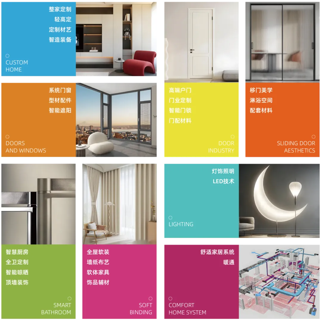 展会现场整家定制·美学设计、门x窗系统、门业定制、厨卫定制、顶墙集成、舒适家居、家居软装、灯饰照明八大新潮主题展区将集中展现引领建装行业趋势的新产品、新技术、新服务、新模式和新生态!