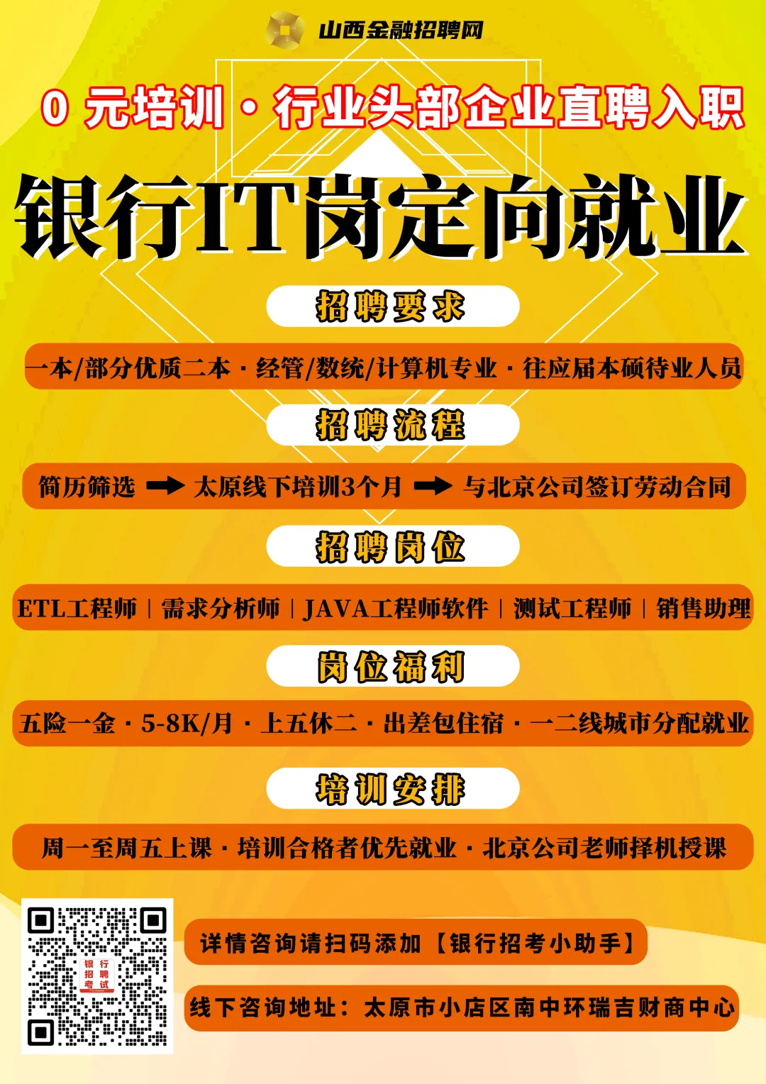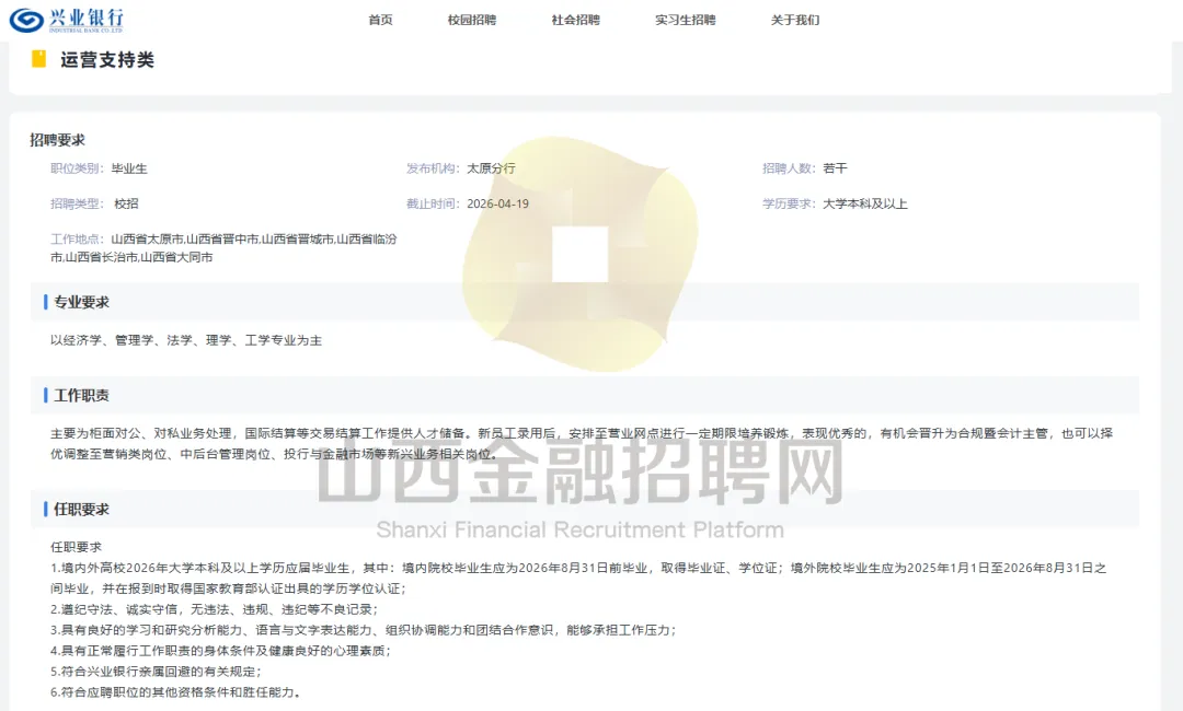 ➤ 工作地点:山西省太原市,山西省晋中市,山西省晋城市,山西省临汾市,山西省长治市,山西省大同市主要为柜面对公、对私业务处理,国际结算等交易结算工作提供人才储备。新员工录用后,安排至营业网点进行一定期限培养锻炼,表现优秀的,有机会晋升为合规暨会计主管,也可以择优调整至营销类岗位、中后台管理岗位、投行与金融市场等新兴业务相关岗位。1.境内外高校2026年大学本科及以上学历应届毕业生,其中:境内院校毕业生应为2026年8月31日前毕业,取得毕业证、学位证;境外院校毕业生应为2025年1月1日至2026年8月31日之间毕业,并在报到时取得国家教育部认证出具的学历学位认证; 2.遵纪守法、诚实守信,无违法、违规、违纪等不良记录; 3.具有良好的学习和研究分析能力、语言与文字表达能力、组织协调能力和团结合作意识,能够承担工作压力; 4.具有正常履行工作职责的身体条件及健康良好的心理素质; 丨华泰证券丨平安金融丨兴业银行丨