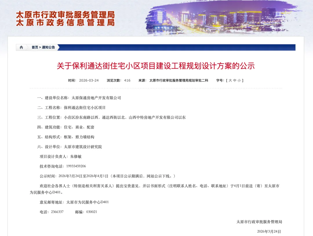 2026年3月24日,太原审批管理局发布:关于保利通达街住宅小区项目建设工程规划设计方案的公示。